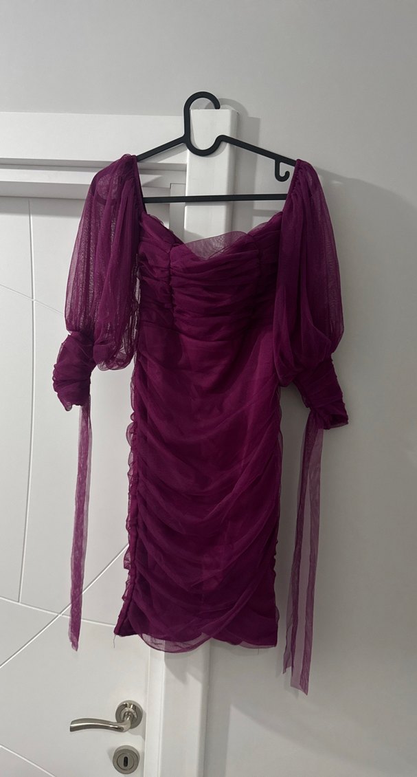 Bu mor midi elbise, drapeli detayları ve hacimli askılı kollarıyla gotik tarzda romantik akşamlar için uygun. Aldım ancak daha hiç kullanmadım.