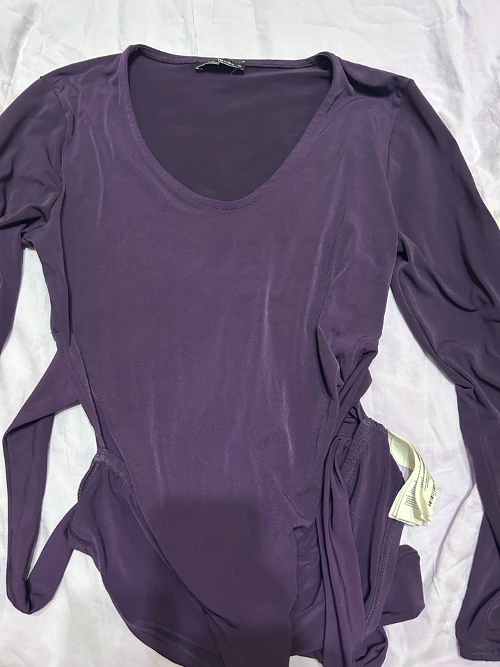 Koyu mor renkte, uzun kollu ve V yakalı, vücuda oturan kesime sahip bluz. İpek gibi dokusu ve drapeli tasarımıyla normal midi boyda.