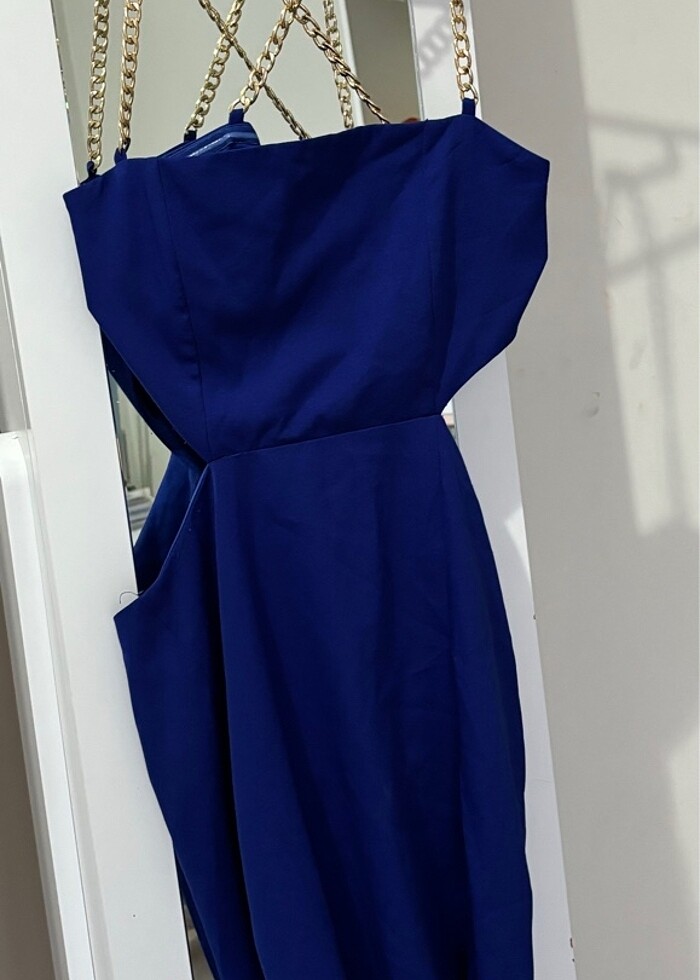 34 beden mini saks mavisi gece elbisesi/mezuniyet elbisesi. Sırtı pencereli askıları altın zincir detaylı. Yalnızca 1 kere giyildi kilo aldığım için satıyorum