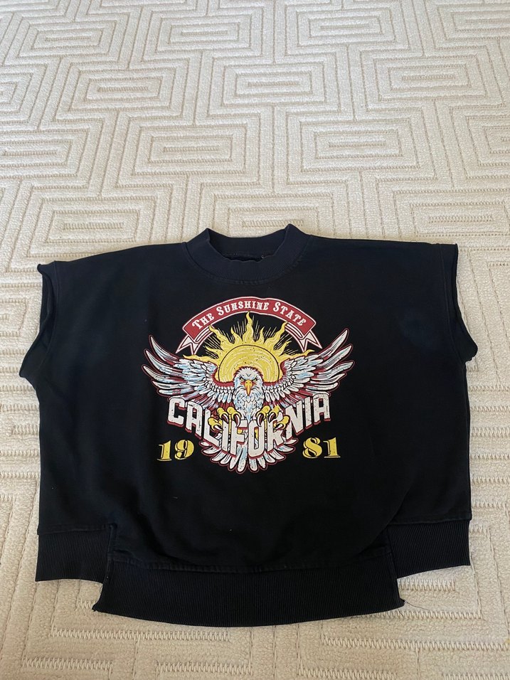 Pamuklu, bol kesim, uzun kollu siyah biker sweatshirt. California kartal baskısı