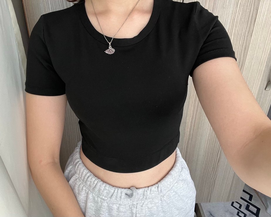 Pamuk kumaştan, yuvarlak yaka ve kısa kollu, siyah, vücuda oturan crop top, gündelik sokak stili için uygundur. ✨ Ürün esnektir s-m giyebilir