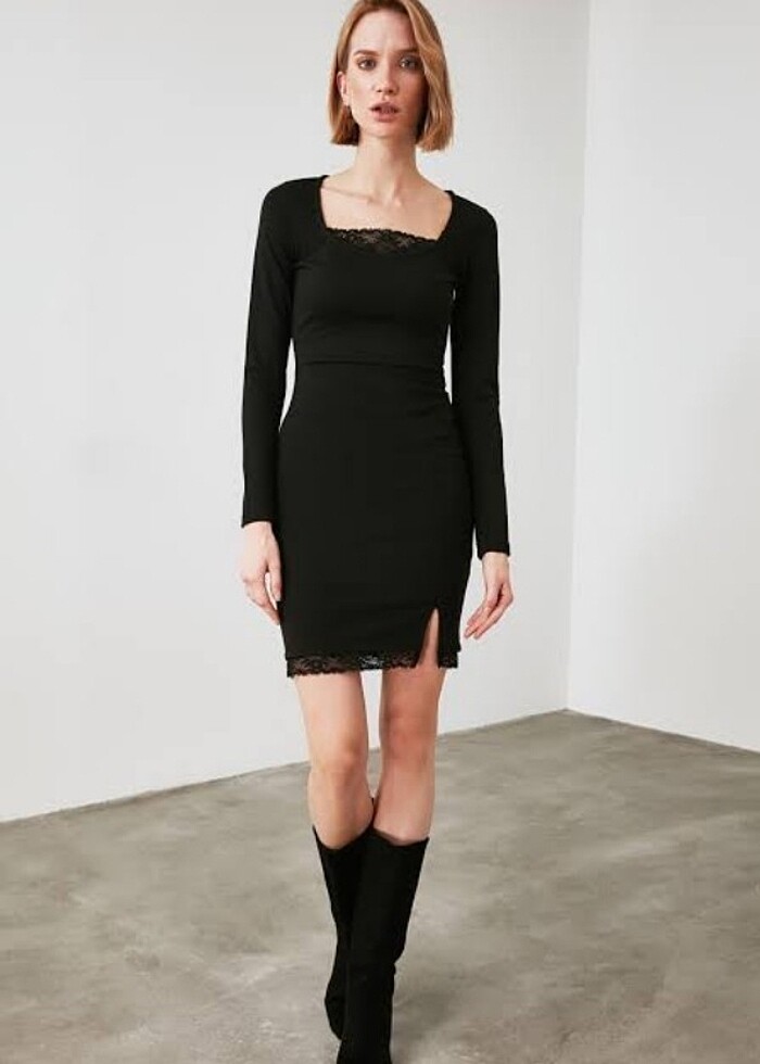 Trendyolmilla marka s beden kare yaka elbise. Yakasında ve eteğinde dantel detayları ve minik bir yırtmacı var. 1 kez giydim, sorunu yoktur.