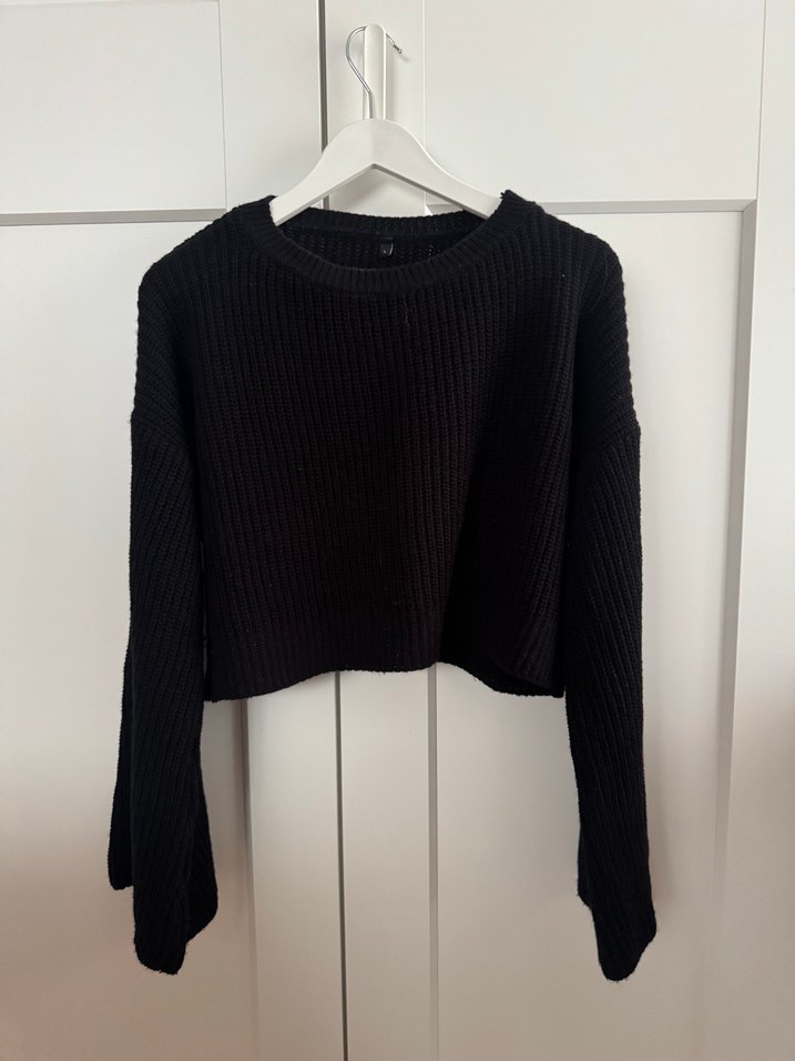 Siyah renkli, uzun kollu, yuvarlak yakalı, oversize kesim triko kazak. Günlük rahat kullanım için uygundur.
