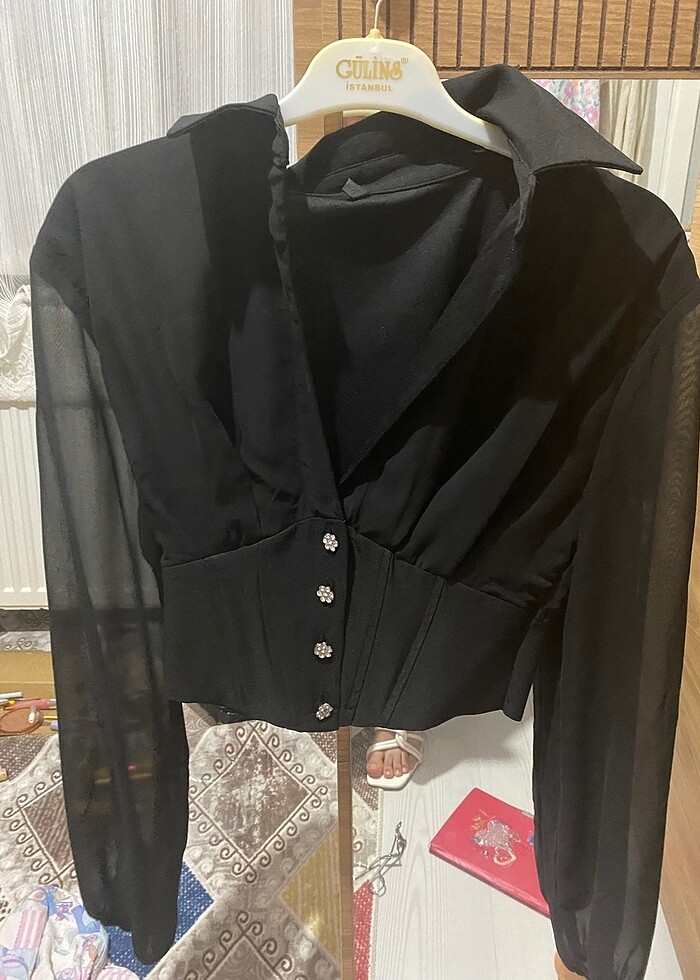 Trendyolmilla Siyah parlak taşlı gömlek bluz korseli kolları şif