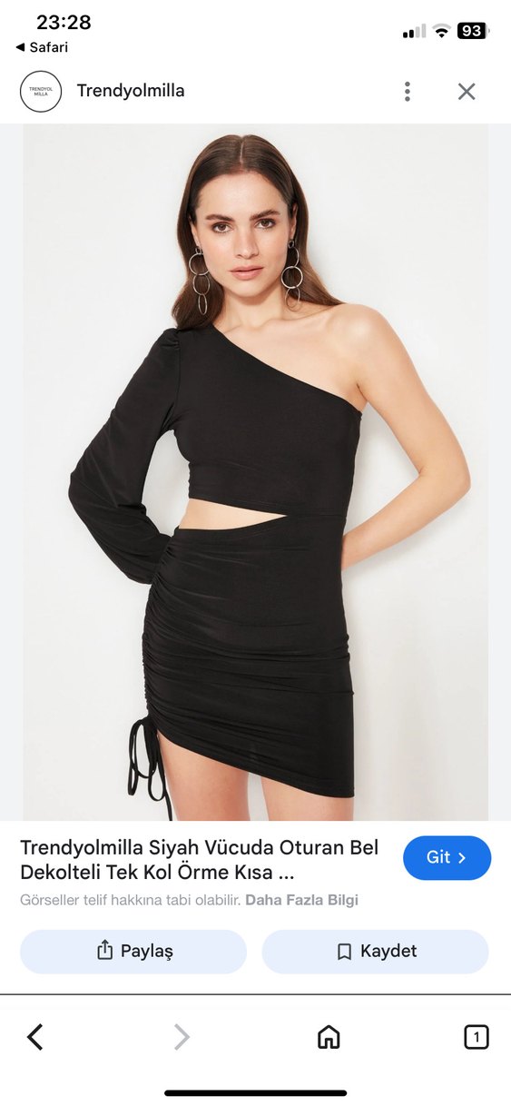 Tek kollu, straplez, vücuda oturan siyah mini elbise, belde drapeli kesimle dikkat çekiyor. Cesur ve şık bir şehir stili için ideal.