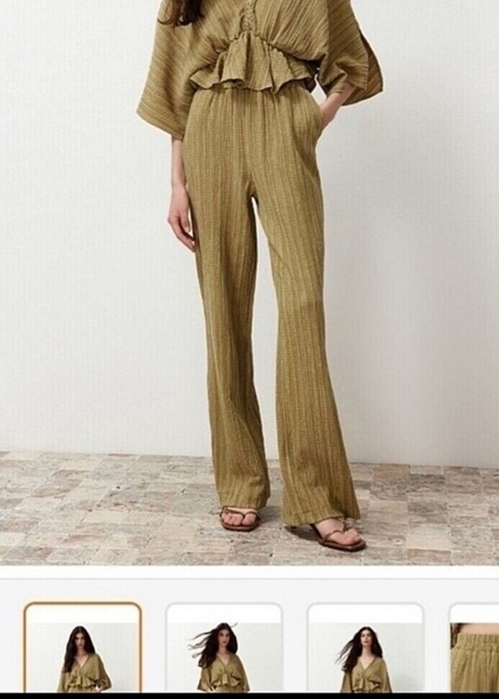 Yağ yeşili dokulu kumaş volanlı dokuma bluz ve Beli lastikli dokulu kumaş dokuma pantolon Güncel fiyatı 850₺ birkaç kez giydim çok şık bir parça 36/S beden