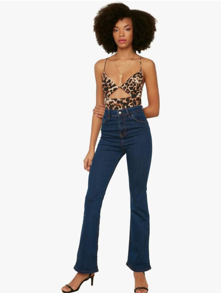Kadınlar için koyu mavi, yüksek bel ve normal uzunlukta denim pantolon. Günlük kullanıma uygun sokak stili jeans.