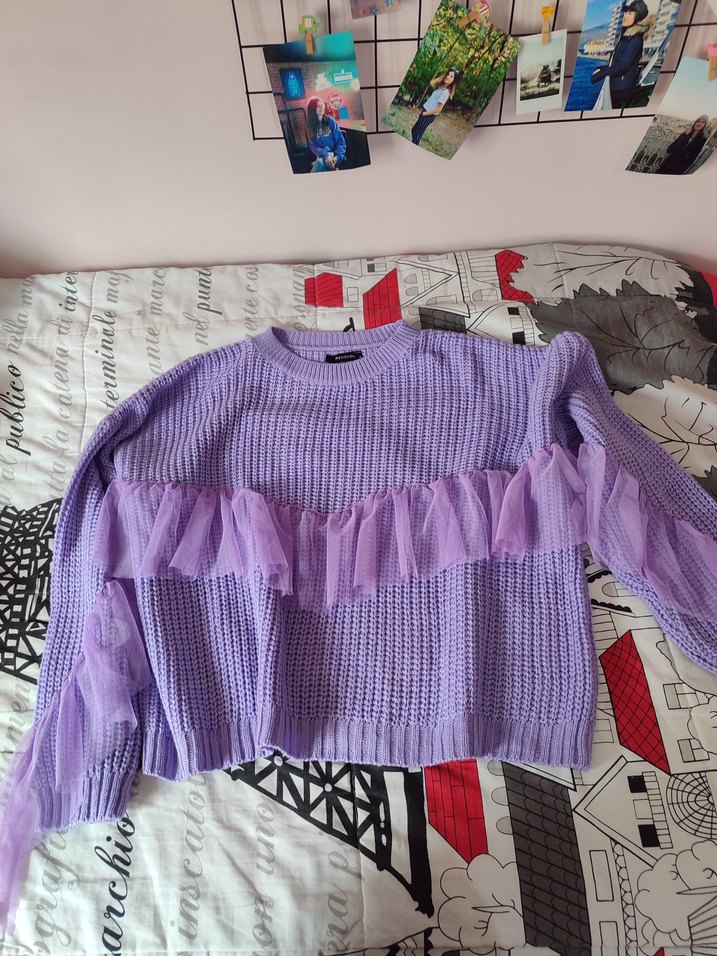 Uuzun kollu, bol kesim örgü kazak. Göğüs ve kollarda volan detaylı. small beden ama geniş m ve l beden giyenlere bile olabilir.lila renginde ama açık lila değil mora yakın. ön kısımdaki tül parça koltuk altı ve kol ile birleşik. yeni gibi. çok fazla giydiğim ve artık giymedigim için satıyorum. hiçbir deformesi yok