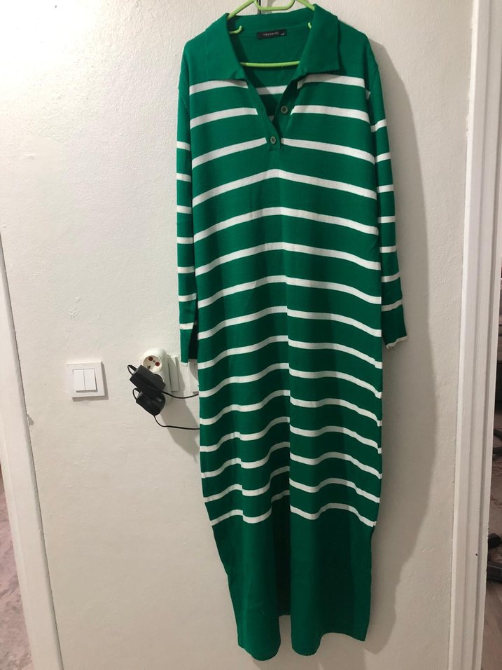 S/M Beren Trendyol Ürünü Yeşil renkte, beyaz çizgili, uzun kollu, triko kumaştan, yakalı ve bol kesim rahat elbise.