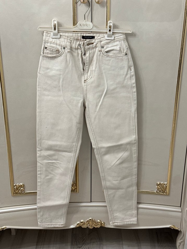 Krem renkli, regular fit kesime sahip kadın denim pantolon, midi boyda ve rahat sokak stili için uygun. Minik bir mavi kalem lekesi var