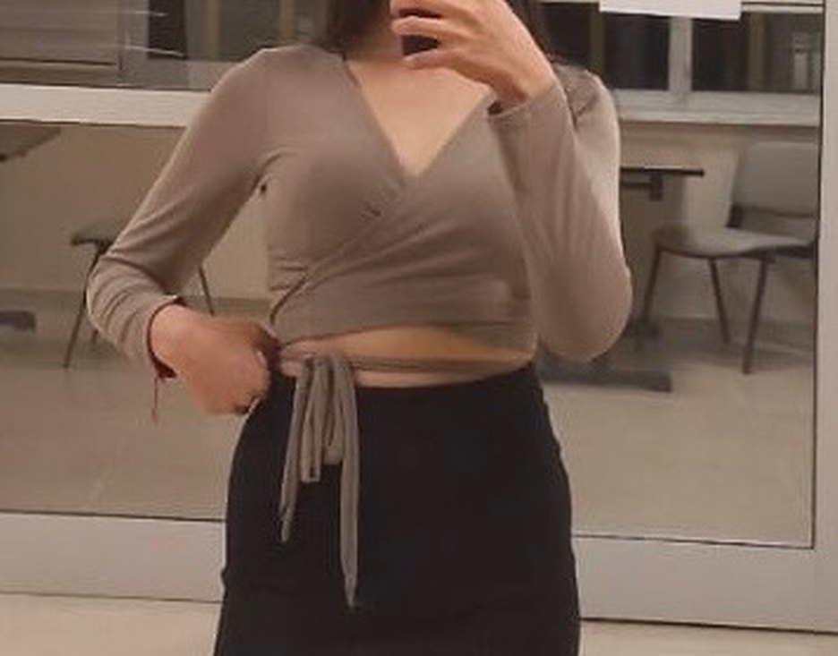 Bej renkte, kuşaklı ve süet görünümlü kadın bluzu, uzun kollu ve V yakalıdır. Trendy casual sokak stiline uygundur. Bir defa giyilmiştir