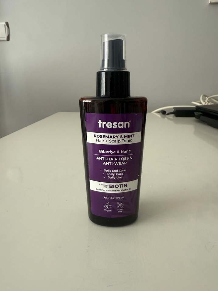 Tresan Biberiye & Nane Saç ve Saç Derisi Toniği, biotin içerir ve saç dökülmesini azaltmaya yardımcı olur. Tüm saç tipleri için uygundur, günlük kullanım için idealdir.