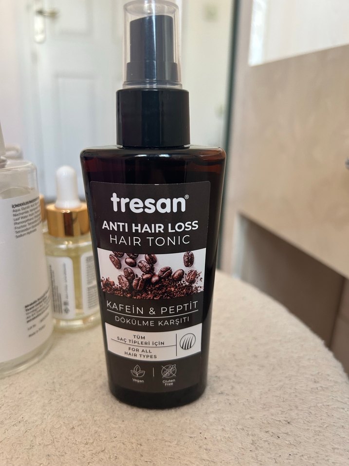 Tresan saç dökülmesine karşı kafein ve peptit içeren saç toniği, tüm saç tipleri için uygundur. Vegan ve hayvanlar üzerinde test edilmemiştir.