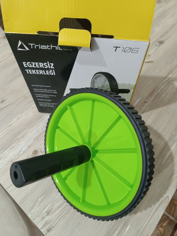 Triathly yeşil egzersiz tekerleği, sağlam sap ve dokulu tekerleğiyle karın kaslarını güçlendirmeye yardımcı olur. Canlı yeşil renk ve baskılı desene sahiptir.