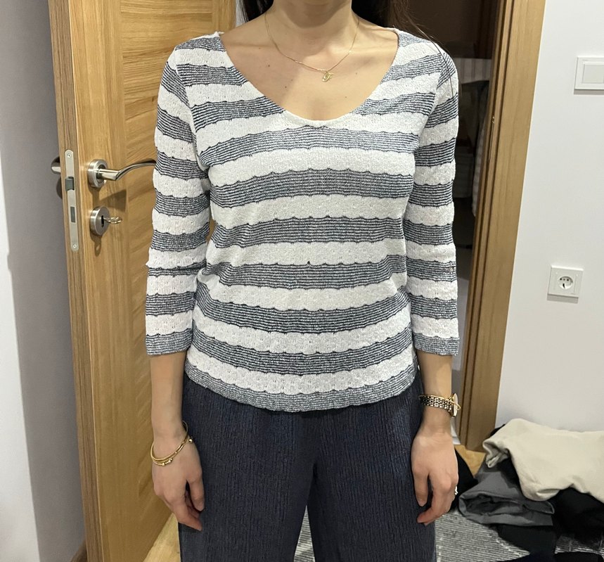Cimri kollu triko, yaka etiketi bulunmamaktadır. Sve M bedene uyumlu olur