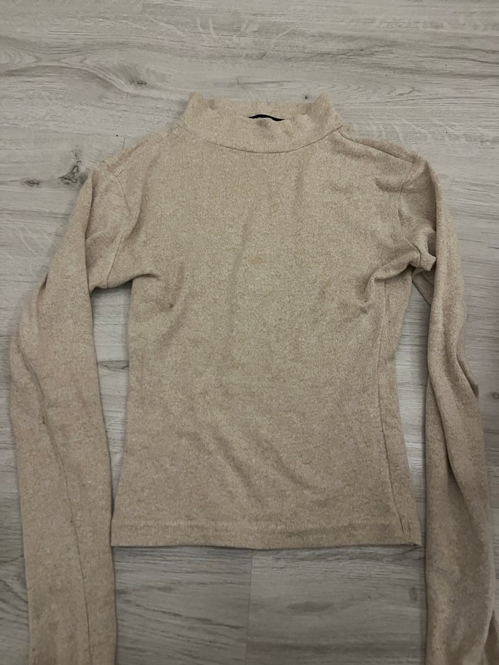 Bej renkli, yüksek yakalı ve uzun kollu, ince kesim kadın triko. Düz ve desen içermeyen tasarımıyla günlük ve sokak stiline uygun, yumuşak keten kumaştan yapılmıştır.