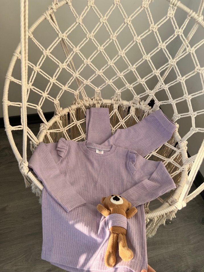 Pastel mor renkte, triko dokulu uzun kollu bebek kız takımı. Yumuşak kumaşı ile rahatlık ve sıcaklık sağlar.