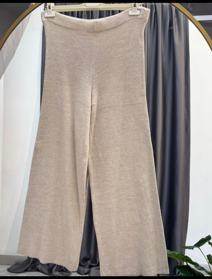 Uzun, bej renkli, örgü dokulu kadın pantolon, rahat kesimi ve günlük kullanıma uygun tarzıyla öne çıkar.