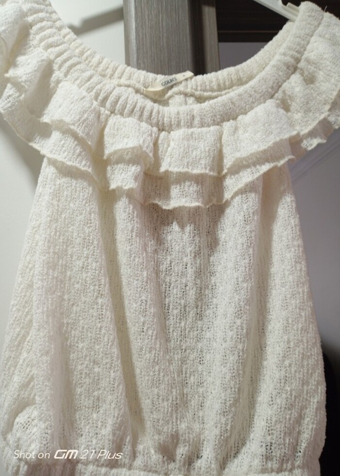 Sadece bir kez giyildi madonna yaka harika bir bluz triko delikli kumaş bel kısmı lastikli