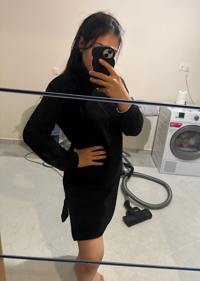 Yırtmaç detaylı triko boğazlı elbise beline kemer ile çok güzel bir şık spor elbise bir kez giyildi