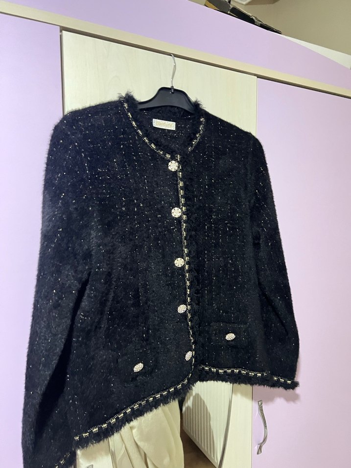 Düğmeli siyah triko ceket, kesik yaka ve uzun kolludur. Salaş kesim ve midi boyda, günlük kullanıma uygundur.