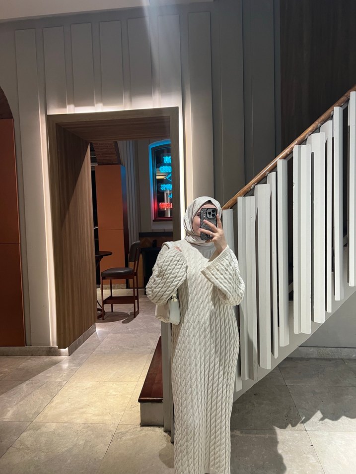 Uzun kolu, bol kesim beyaz örgü triko elbise. Mütevazı ve rahat sokak stili için uygundur. Günlük kullanıma idealdir.