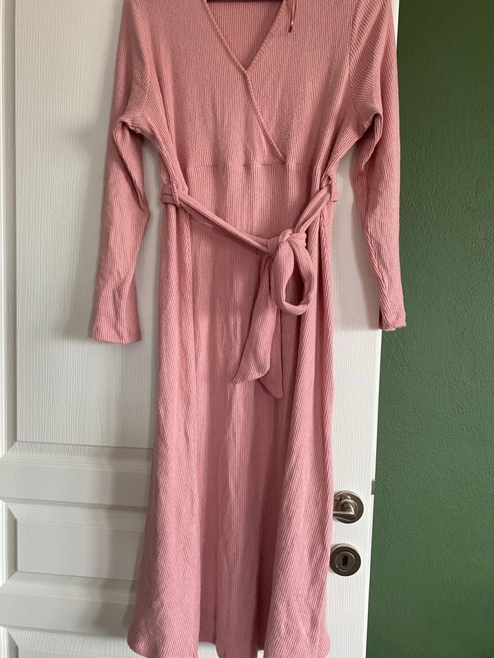 Bebek pembe renk standart ebat diye satılıyor ama ben 3xl bedende hamilelikte bir kez giydim çok rahat triko zaten neredeyse herkese uyuyor çok esnek likralı kumaş kış için ideal önü çapraz gelen v yaka uzun kollu uzun etek elbise