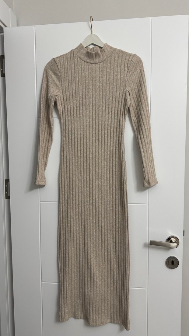 Bej renkte, fit kesimli uzun elbise. Yumuşak örme kumaştan, yüksek yakalı ve uzun kollu, günlük kullanıma uygun rahat bir model.