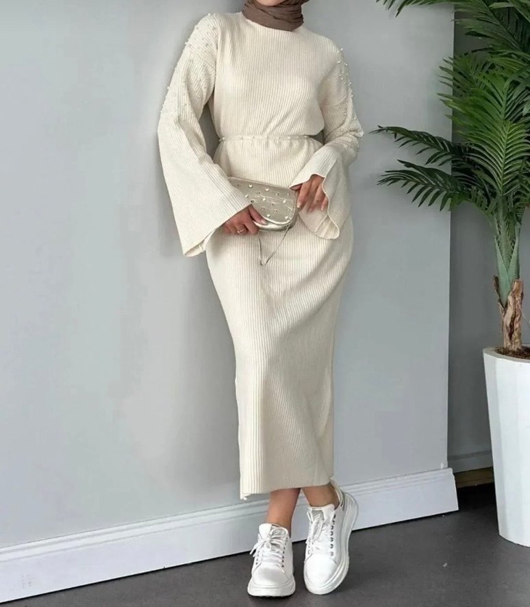 Omuzu incili ekru renkte, uzun ve yarasa kollu kemerli triko elbise.Standart bedendir.