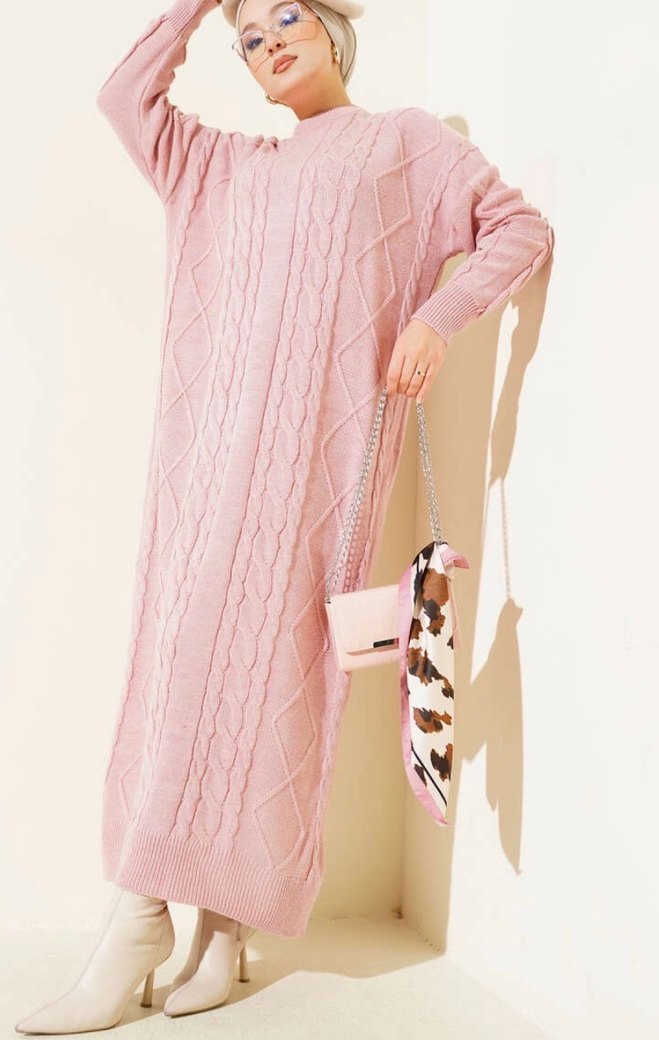 Yumuşak pembe renkte,, uzun ve salaş kesim örgü triko elbise, rahat sokak stiline uygun. 1 kez giydim Çok rahat sıcak tutuyo ve çok tatlı duruyor üstte Standart beden S m l xl bedenlere olur