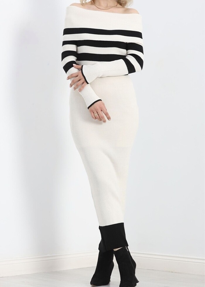 Triko elbise krem siyah çizgili