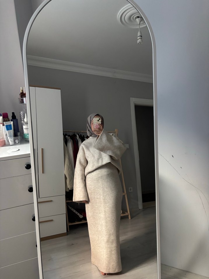 tok , triko kumaştan etek kazak takım, oldukça sıcak tutar tam kışlık ,Standart beden,40 bedene kadar rahat olur 42 de olur. sadece bir kere giydim.markası hm takım olarak geçiyor modaaksadan aldım.