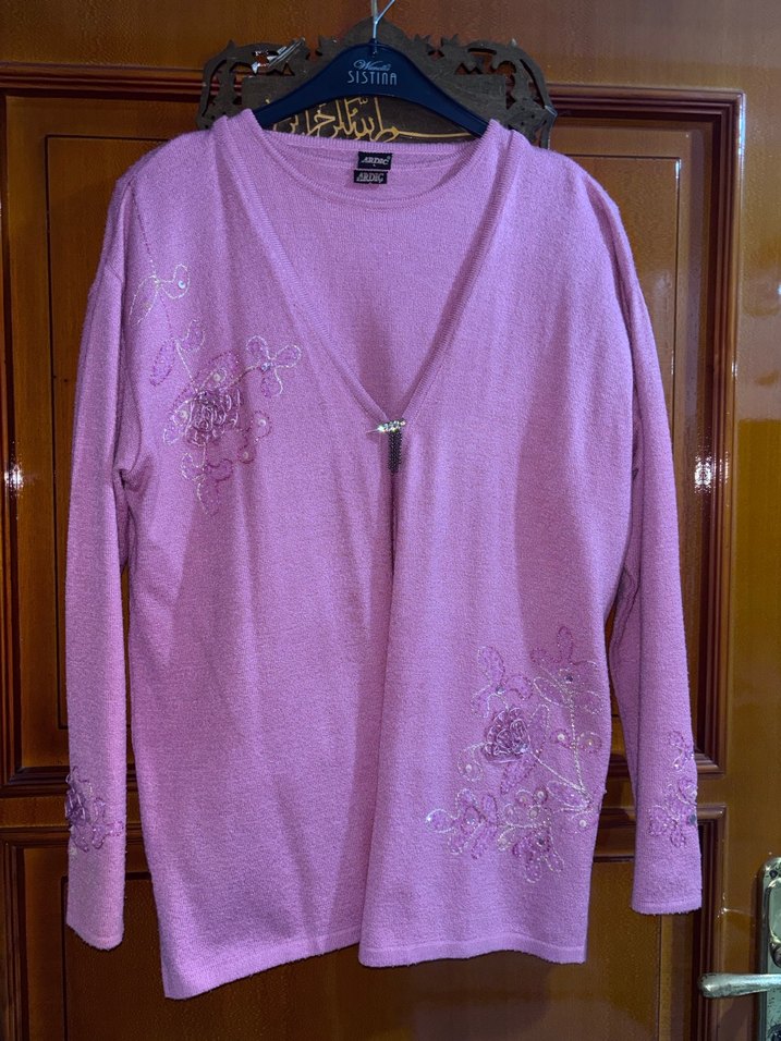 Yepyeni sorunsuz pembe renk L beden tişört hırka takım şeklindedir. #takım #hırka #triko #tişört #tesettür #tunik #kazak #vintage #hırkatakım