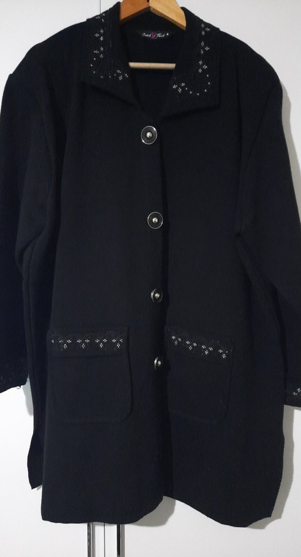 Siyah midi uzunlukta, iki koltuk arası 60 cm boy 85 cm basen 65 cm düğmeli ve yakalı bu kaban, uzun kollu ve rahat kesimdir. Yumuşak, sıcak dokulu kumaştan üretilmiş, ön ceplerde küçük süslemeler bulunur.