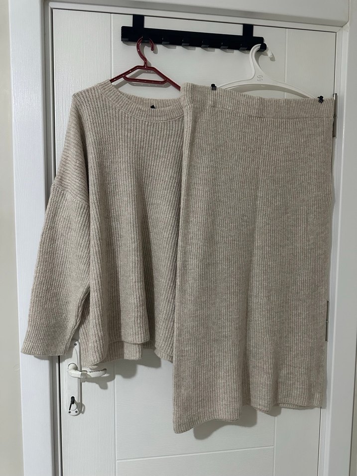 Bej renkli, uzun kollu, yuvarlak yakalı triko kazak ve etekten oluşan rahat kesim bir takım. Yumuşak dokulu triko kumaşıyla gündelik kullanıma uygundur. Çok rahat ve şıktır hiç giyilmedi. 4 XL uyumludur.