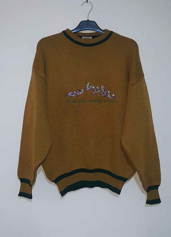 Yuvarlak yakalı, dökümlü, hardal renk, hiç kullanılmamış triko kazak. M bedene uygundur.