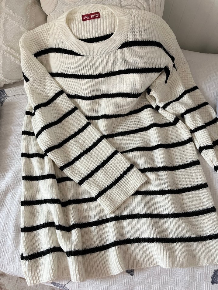 Kadınlar için uzun kollu, yuvarlak yaka, bol kesim triko kazak. Beyaz zemin üzerinde siyah yatay çizgilerle rahat ve günlük kullanıma uygun.