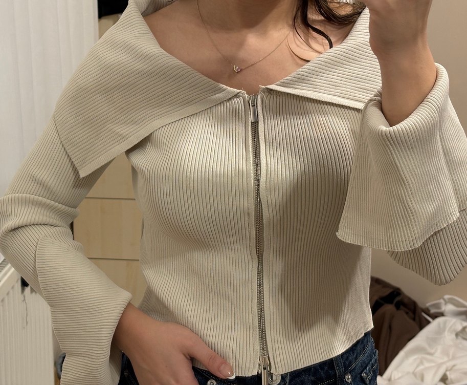 Fermuarlı, yakalı ve uzun kollu bej triko kazak. Fitted kesimi ve midi boyu ile Paris tarzı günlük şıklık sunar.