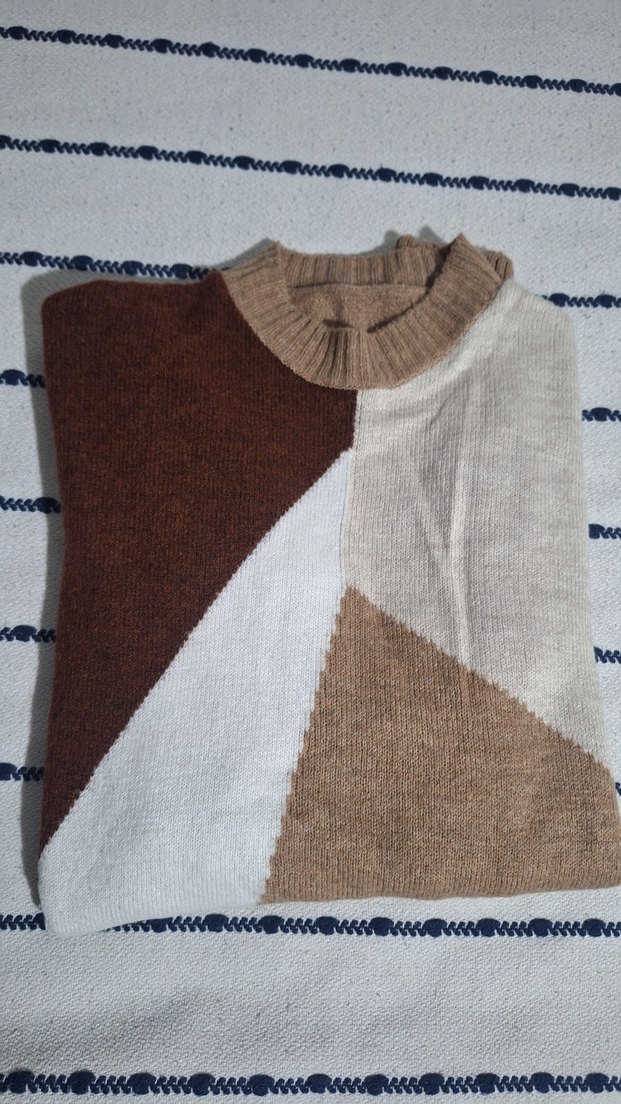 Triko boğazlı ve uzun kollu kazak. Bol kesim ve uzun boy (87cm) kahverengi, bej tonlarıyla rahat kazak. 2 3 defa belki giyilmistir bi kısmında tüylenme var ama jiletle ya da tüy toplayiciyla geçer