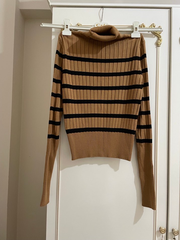 Bu kahverengi, çizgili triko kazak boğazlı, uzun kollu ve vücuda oturan kesime sahiptir. Normal midi uzunluğunda, rahat ve sokak stili için uygundur.