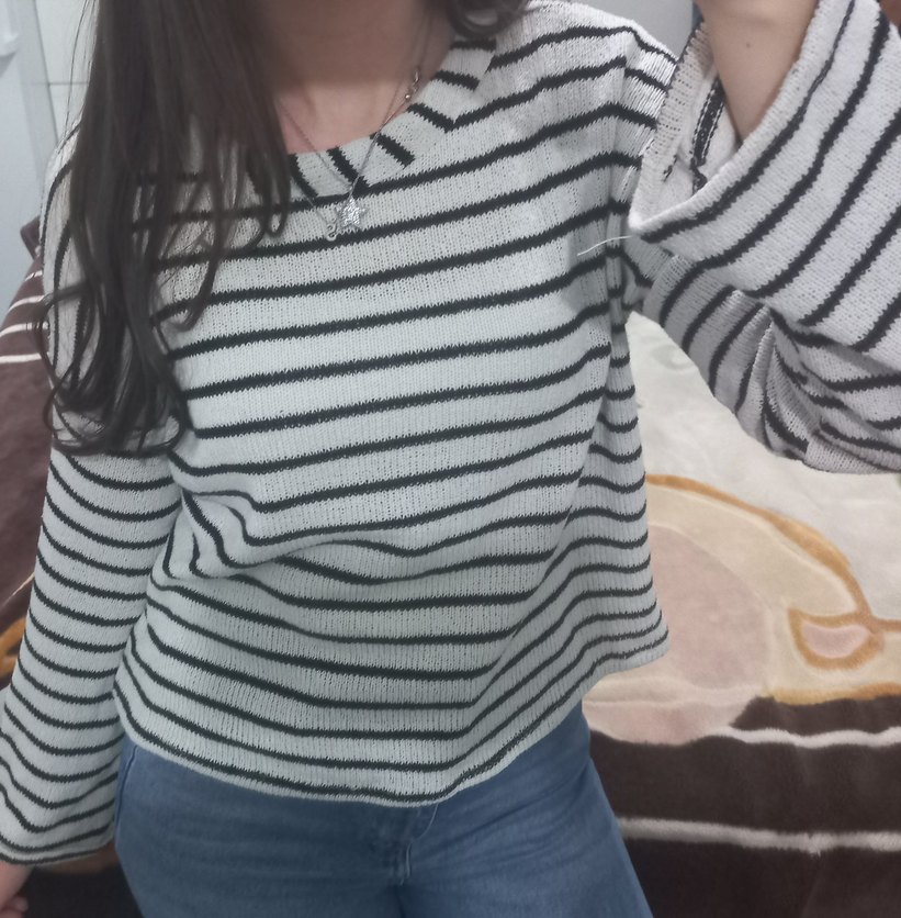 S-M beden,az giyildi Gri renkli, yuvarlak yaka ve uzun kollu örme triko kazak. Salaş kesim, çizgili desene sahip, günlük kullanıma uygun midi boyda.