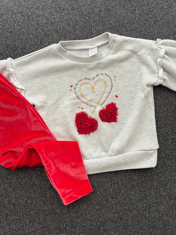 Gri renkli, uzun kollu, nakışlı ve örgü detaylı üst ile canlı kırmızı kadife pantolondan oluşan bebek kız takımı. ❤️ Üst birkaçkez altı hiç giyilmedi