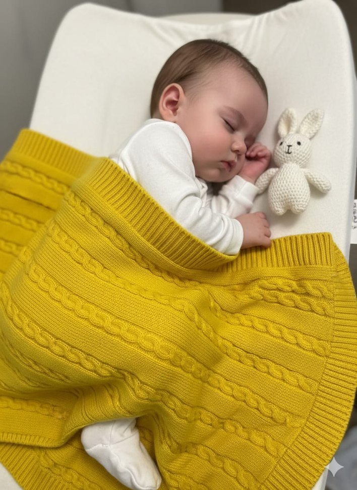 Pastel sarı renkli, yumuşak örgü bebek battaniyesi, çocuklar için rahat ve sıcak tutar. saç örgü konforlu dokusu ile öne çıkar.