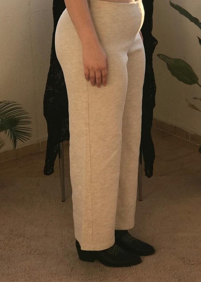 Kumaş Tipi:Örme Paça Tipi:Geniş Paça Bel:Yüksek Bel Desen:Düz Renk:Ekru Cep:Cepsiz Astar Durumu:Astarsız Ortam:Casual/Günlük Kalıp:Bol Kuşak:Lastikli Ürün diz kısmında çok hafif lekeler mevcut çıkarılabilir derecededir herhangi bir sökük veya deforme bulunmamaktadır kumaşı pamuklu'dur iç göstermez ürün 42 44 beden için uygundur detaylı bilgi için dm ulaşabilirsiniz