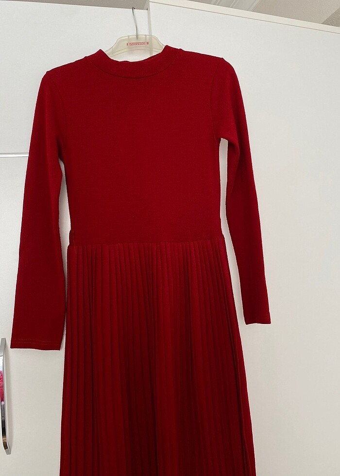 Yumuşacık dokusuyla kış aylarında hem şık hem sıcak tutan triko elbise. Bordo-kırmızı tonlarıyla dikkat çeker, alt kısmındaki pliseli detay ise zarif bir hareket katıyor. Çok az kullanılmış, tertemiz durumda.