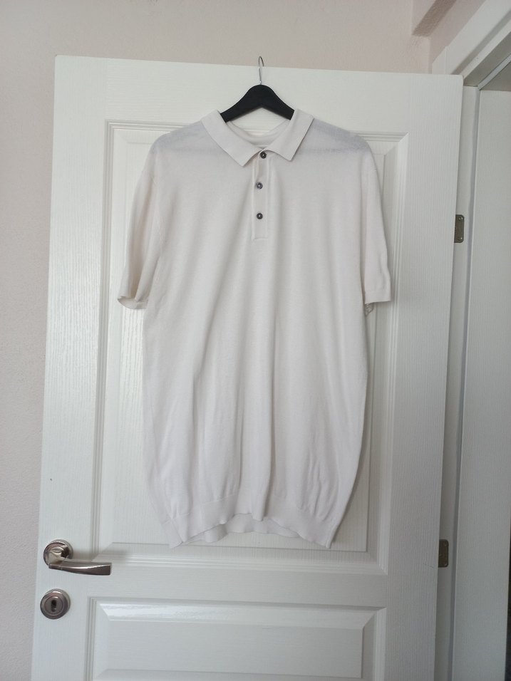 zara triko polo yaka tişört. önünde silik sarı bir leke var leke çıkarıcıyla denemedim. iç etiketi kesik. L bedene olur. Iki omuz arası 49 cm Iki koltuk arası 54 cm Boy 77 cm
