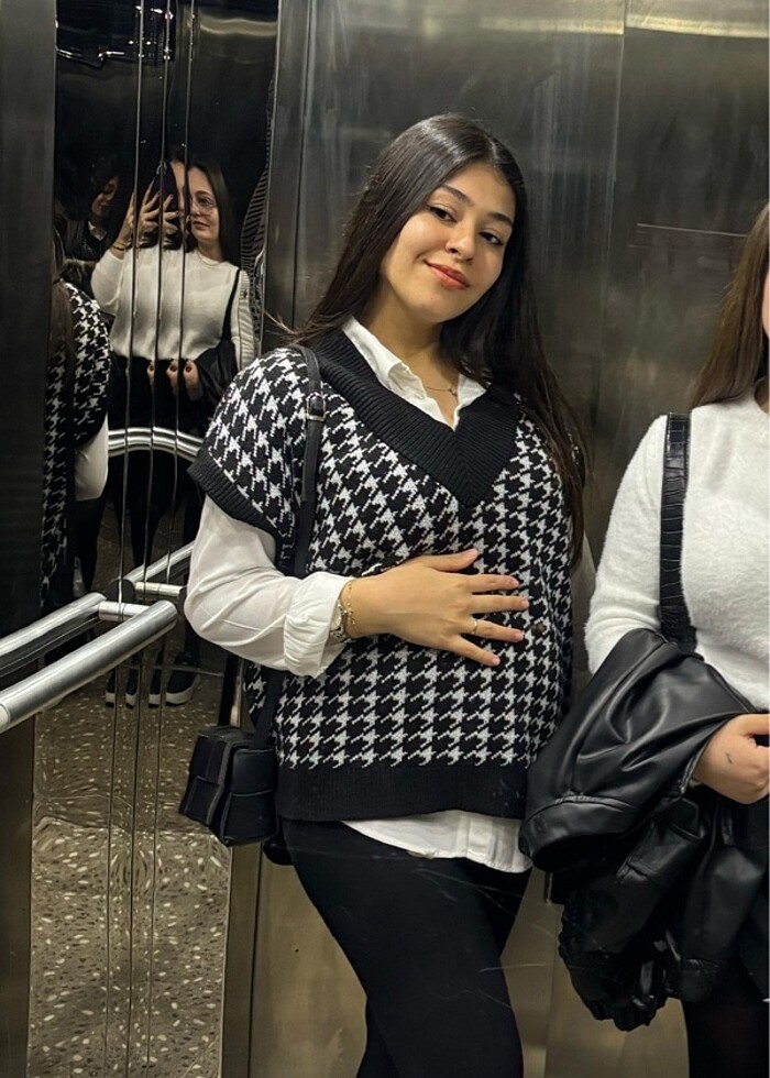 Kaz ayağı desenli triko süveter bir kez giyildi oldukça salaş hoş bir parça kışın bir çok kıyafetle kullanılır 60 kilo iken giyildi