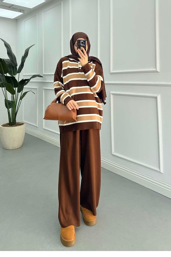 Kahverengi zebra desenli, triko dokulu, uzun kollu boğazlı ve bol kesim kadın eşofman takımı, rahat sokak stili için uygundur. Sıfırdır etiketi üstündedir 36-44 beden arası uyumludur