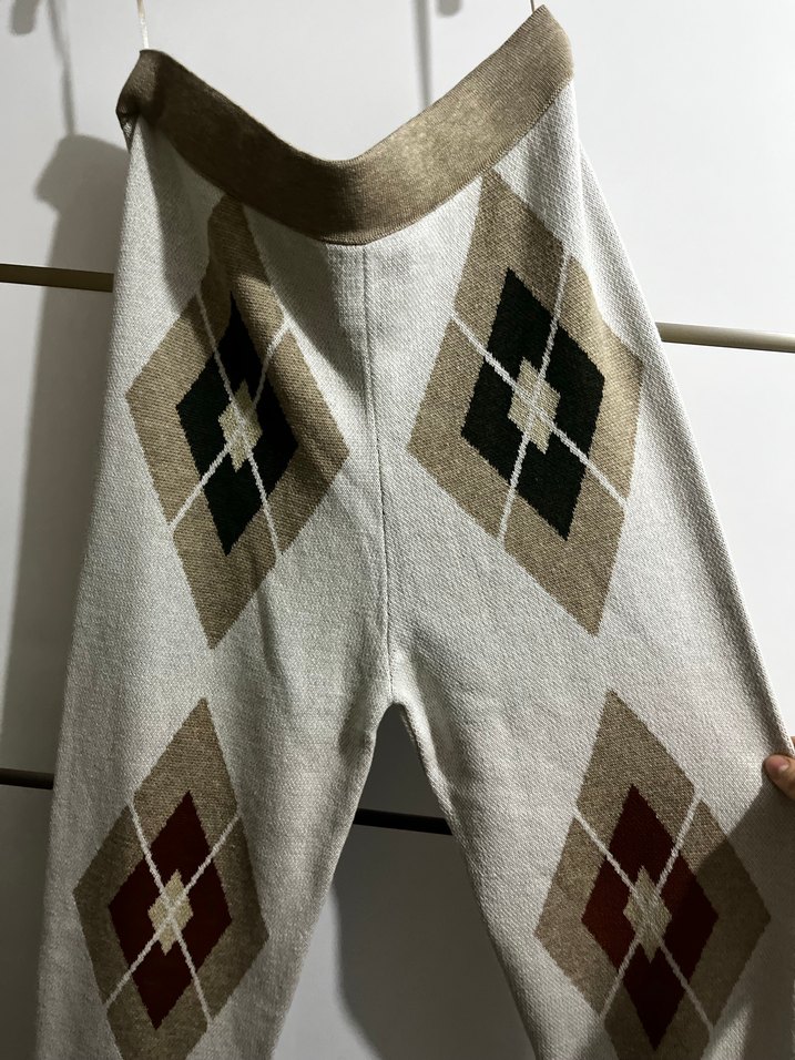Bej renklerde, örgü kumaştan, rahat kesim ve elmas desenli kadın pantolon, günlük kullanıma uygun sokak tarzında.