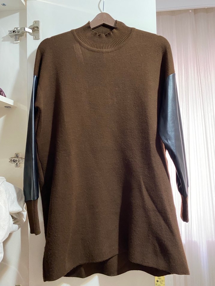 Kahverengi boğazlı kadın kazak, deri detaylı uzun kollu, bol kesim, midi boyda, rahat sokak stili için uygundur. Birkaç kez giyildi standart beden